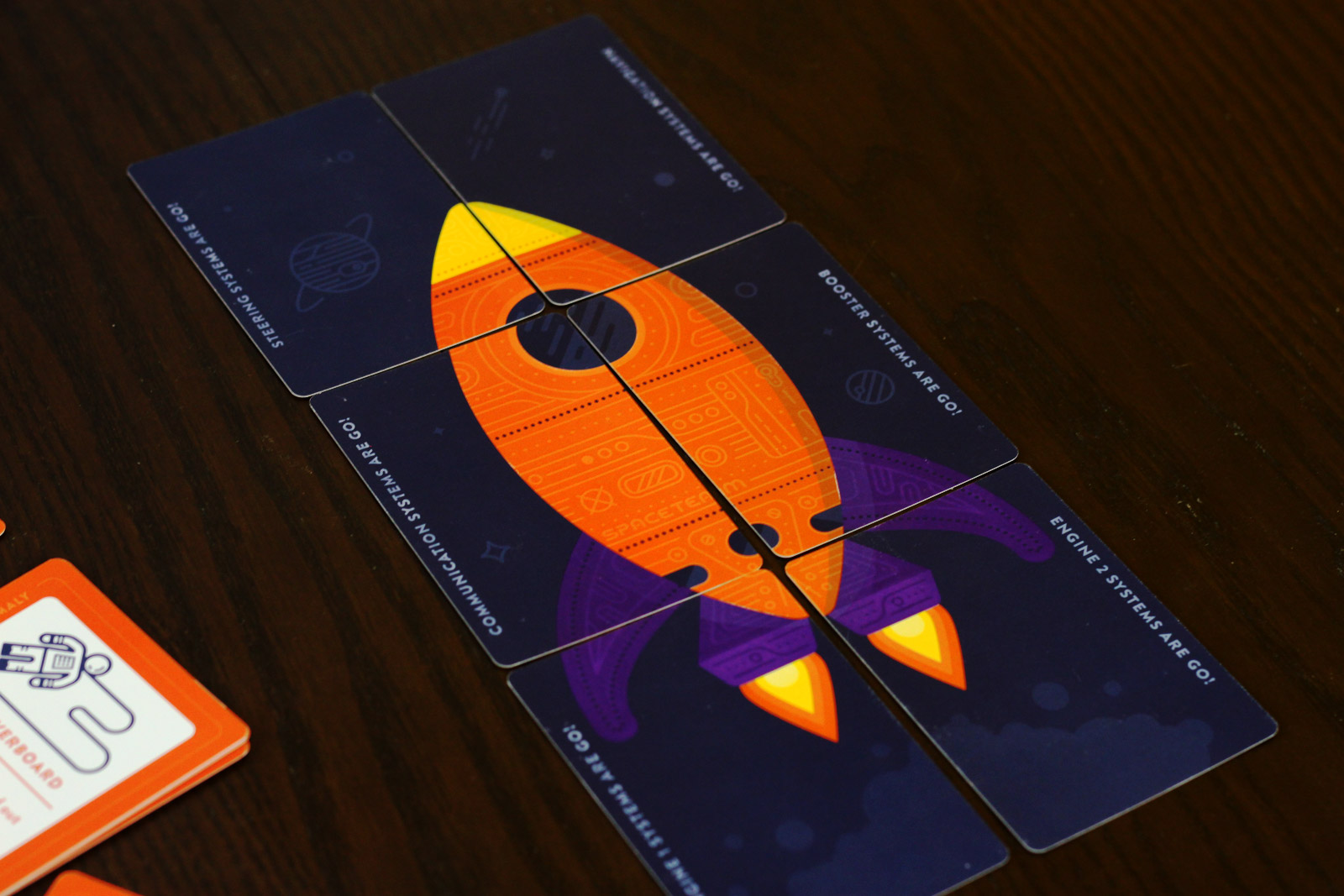 Basically, it’s just kind of weird that the Systems Go cards are so separate from the Malfunctions. You don’t even need tools to drop the System card in place, you just shout “Engineering systems are go!” and place it in the center. The shouting part is fun, but there’s a disconnect. The game barely even needs the System cards, and you could simply play without them, declaring victory only when every Malfunction stack is cleared. If you want to shout Systems are Go for effect, you can even deal out the malfunction decks, then deal out the System cards to go at the bottom of the stack. Boom!
