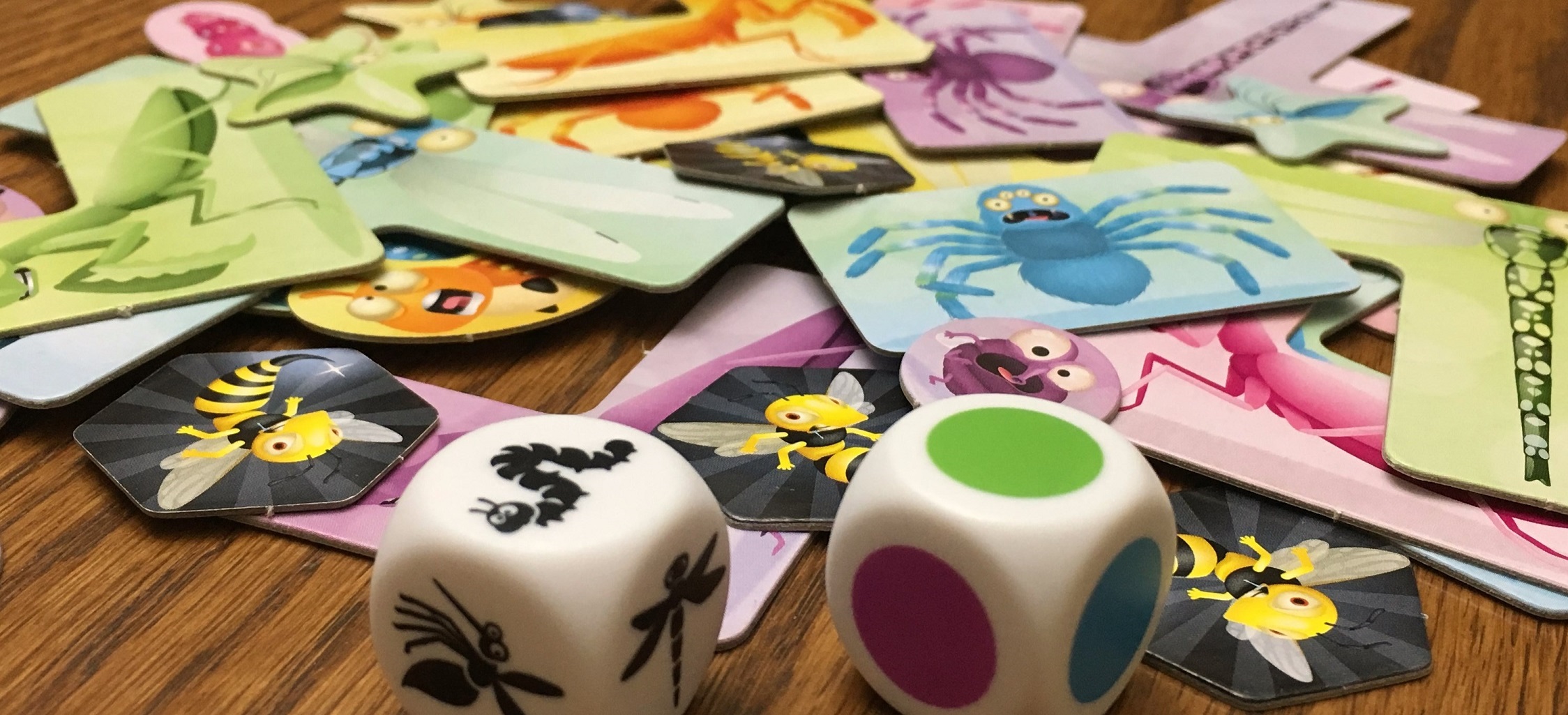Except for those yellow jackets, each insect specie also comes in one of six colors. A bug’s type and color are important. On a round, one player rolls two dice to determine the plumpest treat. One die corresponds to the insect specie and the other a color. Players simultaneously identify where the matching token is and launch their sticky tongues at it! The first to snatch it with their viscous hydrostat and remove it by hand earns a yummy token.
