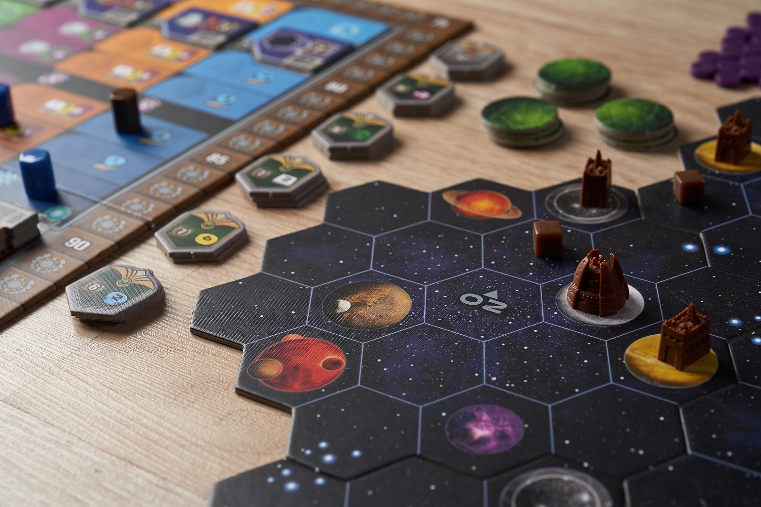 To begin, each player receives a unique alien race, represented by a faction board. The modular board tiles are arranged, and the technology tiles are randomly assigned to the nine spaces on the technology board. A random advanced technology is assigned to each technology track, two end-game scoring conditions are randomly chosen, one round-scoring bonus tile is randomly assigned to each round, and round boosters are randomly chosen based on the number of players. Players set their buildings on their individual faction boards, choose starting locations on the main board, and in reverse turn order choose a round booster for the first round. The first player begins.
