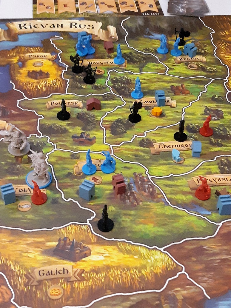 You see, each round ends with the claim phase, when players track their progress. But the interesting thing here is that while players can move up on the claim tracks, they can never move down. You can rule five regions one turn and two the next, and your legacy is still remembered for its heyday. Granted, players are generally rewarded for holding on to their gains–it’s easier to move two steps forward if you haven’t taken three steps back–but this claim system allows players to shift gears quickly if someone has destroyed their plans or to capitalize on opponents’ weakness. I like this. I also like that the points granted by the claim board are more difficult to get the farther up the track they are. Holding five regions is difficult and worth 5 points–not too shabby in a game where a winning score is often around 20. But if you can hold five regions including Kiev and Novsgorod, that’s worth a game-changing 8 points. Similarly, getting 9 goods on your boat might get you 5 points, but if you can completely fill your boat–meaning you’ve taxed for every kind of good (no mean feat)–you’ll get 8 points.