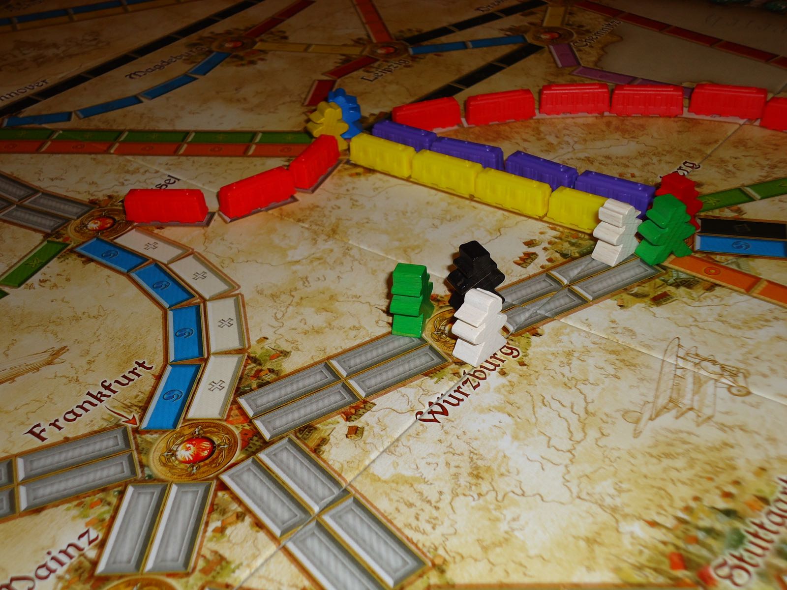 The destination ticket decks simply allow you to knowingly choose long or short routes. In other versions of TTR, all the routes are lumped into one deck. You don’t know what you’re going to get and since you must keep at least one route card of the three you draw, it’s easy to get stuck with a route you have no chance of completing. Then at the end of the game, you have to take the point loss from an uncompleted route. The dual decks solve this problem by allowing you to choose a mixture of cards so hopefully you can get some routes you can complete. (You also draw four cards in Germany, instead of three, and you can choose any mix you want from the two decks, as long as there are cards available.) You may still get stuck with something you can’t finish, but at least you can make a strategic choice to up your odds.Â