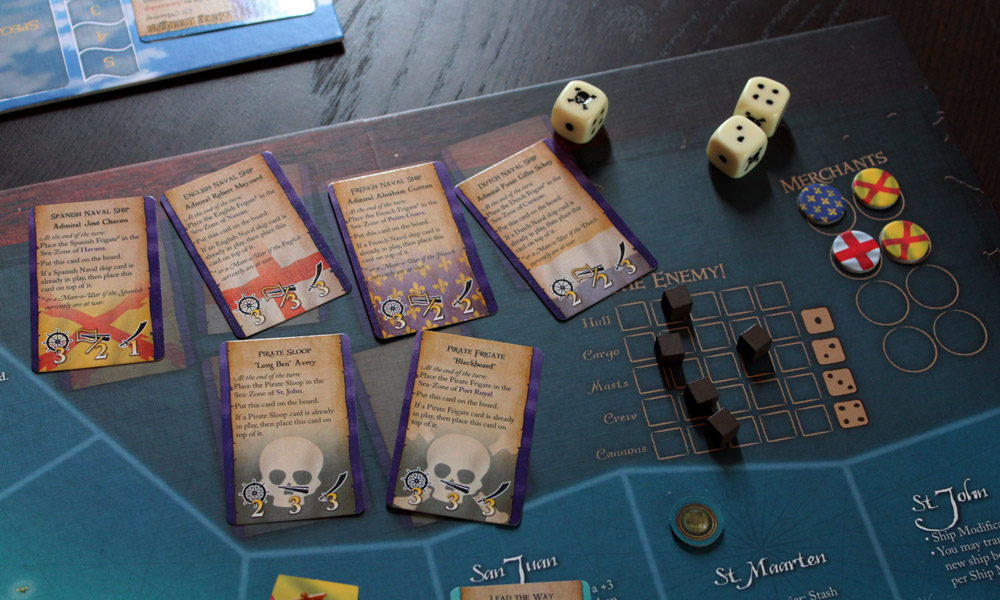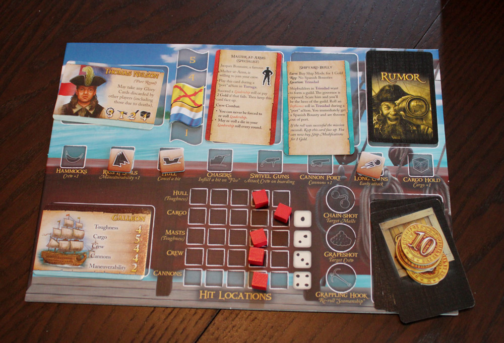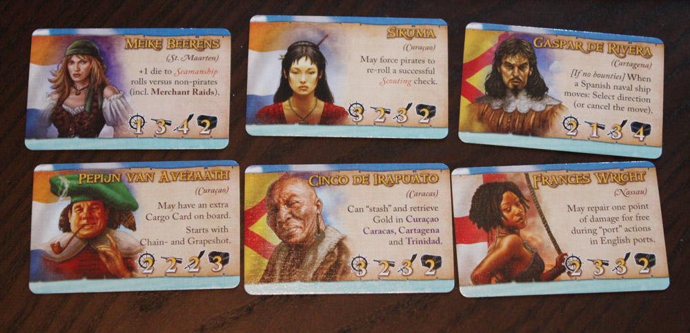 Each player takes control of a Captain, randomly dealt out at the start of the game, which features stats like Leadership, Seamanship, and Influence, and a ship which has stats such as toughness, cannons, and crew.
