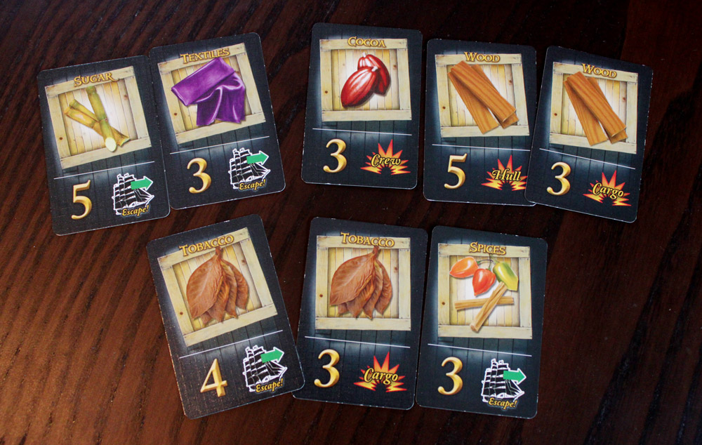 A “Port” action must be taken at port, and allows a number of activities; from recruiting Crew, to selling and buying goods, to repairing or upgrading your ship, to buying an entirely new ship altogether. While I won’t go into to much detail regarding mechanisms, allow me to detail buying and selling of goods. To sell, you simply offload any goods from your cargo that you wish to sell. Goods sell for 3 gold each, unless they happen to be in Demand, in which case they earn 6 gold each. When you buy goods, you draw 6 cards from the “cargo” deck, discarding any that are in Demand and replacing them. Then, you can buy any for 3 gold each. If this sounds like a low profit margin to you, it is, but fortunately there’s a ‘hook’ (pun intended). If you draw multiple cards of a single good type, each additional card decreases the cost of that good to you by 1, down to a minimum of 1 gold. That means if you draw 2 “cocoa beans” cards, you can buy each for 2 instead of 3, and if you draw 3 “Wood” cards you can buy them for 1 gold each.