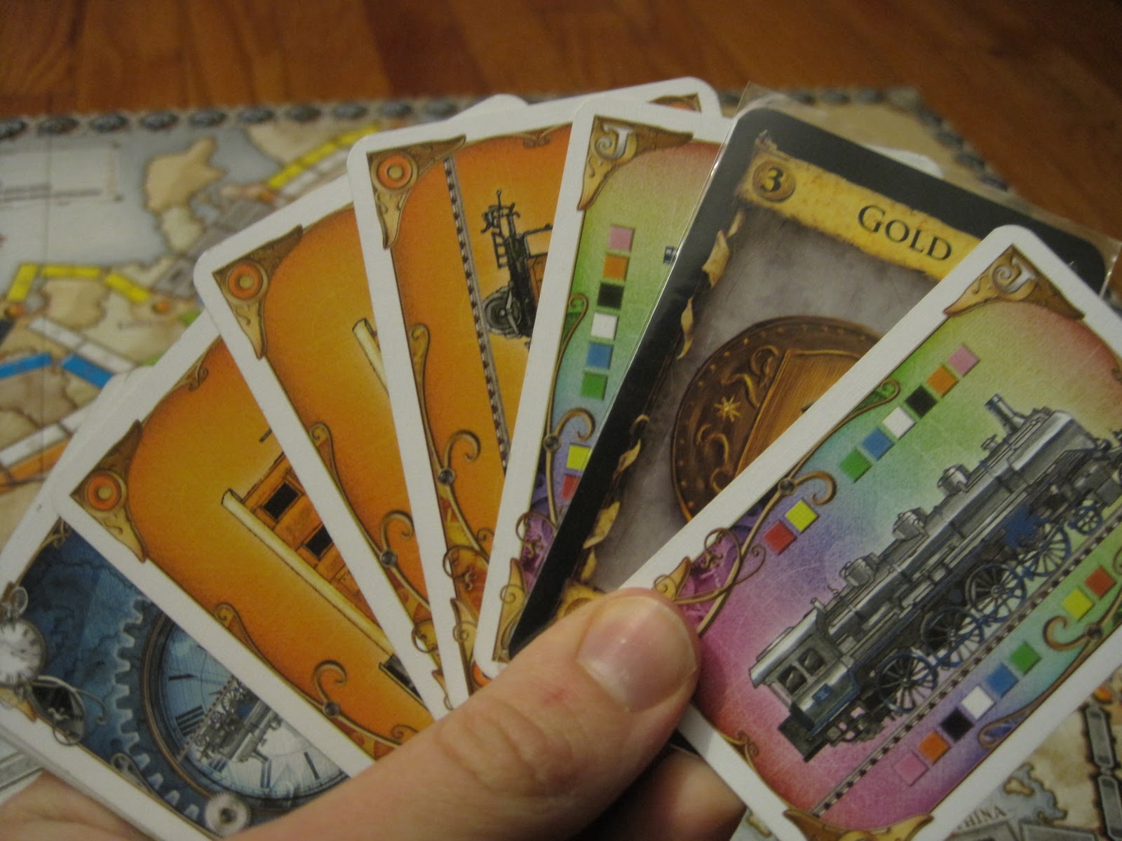 Second twist: there are certain special tracks on the map, namely tunnels and ferries. Because you can’t always see your way to the end of the tunnel when you enter it, tunnel tracks can be of varying lengths. In order to claim a tunnel, players must first reveal the color of train cards they wish to use to claim the track, then three cards are revealed from the top of the deck. If any of these cards match the color, the claiming player must use additional cards to claim the track. There are also ferry tracks (which, as you might guess, go across water). To claim these tracks, players must have a number of locomotive cards to combine with their set of cards.