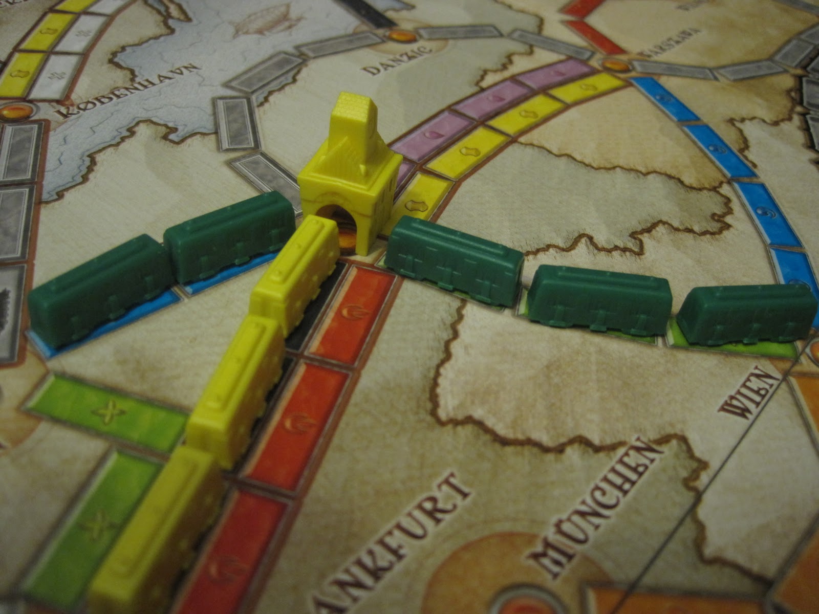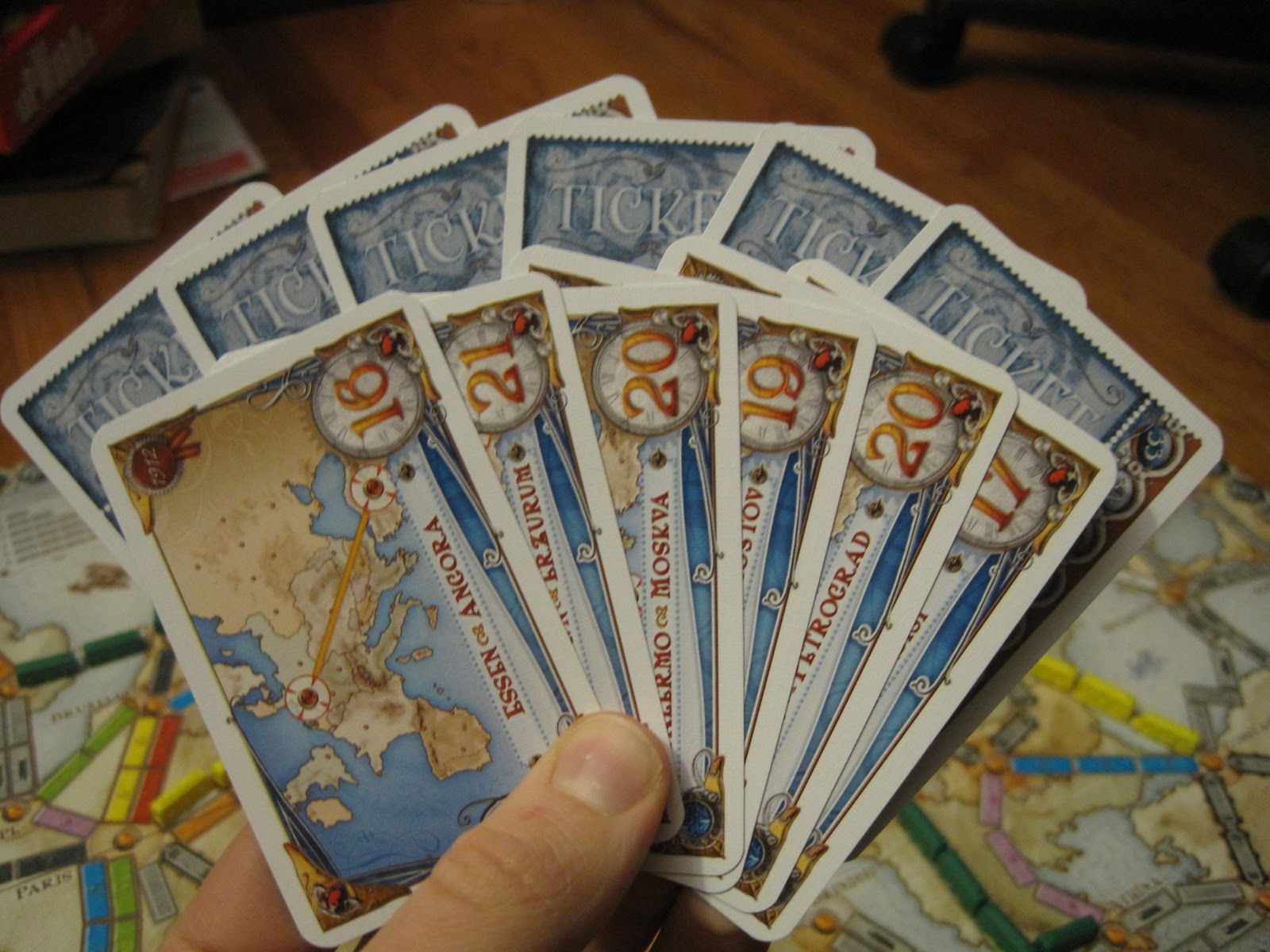 The other criticism is that there aren’t nearly enough long routes included in the base game, so it’s easy to tell where your opponents are headed. This is absolutely true, which is why I recommend procuring the Europa 1912 expansion almost right away. (There’s a “depot” part of the expansion, too, but really: buy it for the new destination tickets and the Big Cities variant. The game doesn’t need depots; I still haven’t used them.)